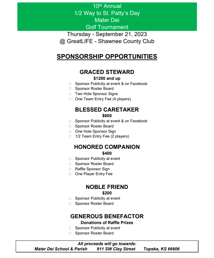 Registration is now open for the 10th Annual 1/2 Way to St. Patty’s Day Golf Tournament benefiting Mater Dei Catholic School.